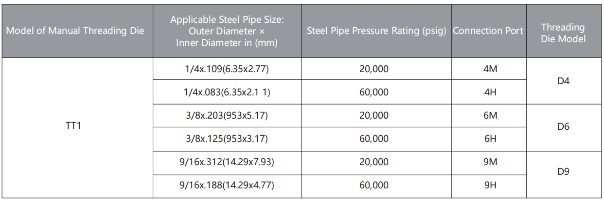 The manual threading die consists of a die, a guiding copper sleeve, a tool body and a handle. The die is designed for left-hand threading on 1/4", 3/8" and 9/16¡± MP, HP and UHP steel pipes. The die body and handle can be equipped with different sizes of die and guiding copper sleeve, so the tool can be used to process a variety of sizes of steel pipe.